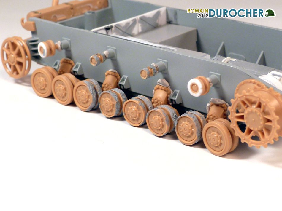 Ce qui implique la modification des galets de retour, car Tamiya fournit des galets métal, alors que l'engin est équipé de galets en caoutchouc. Mais aussi des barbotins, qui sont ajourés au lieu d’être plein. Cependant, Tamiya fournit deux jeux de roues tendeuse, dont celles requises.