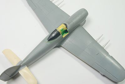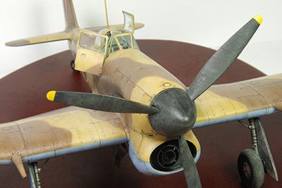 Le filtre tropical est réalisé en scratch puis la maquette est préparée pour la peinture. D'abord une couche de laque Tamiya LP11 avant la peinture des cocardes et de la lettre code au pochoir.