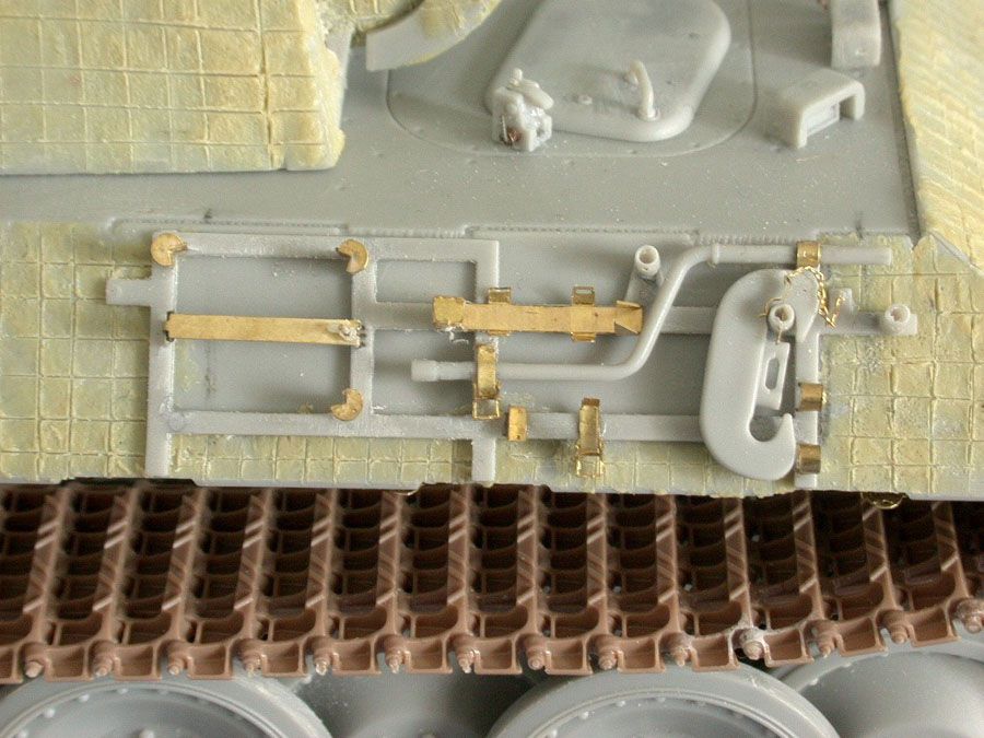 Les supports des attaches-outils sont affinés par ponçage puis détaillés avec des attaches en photodécoupe "Aber" ou en carte plastique (épaisseur 0,13 mm). Ces ensembles sont mis de côté pour être collés en dernier sur les flancs du char en fin de montage.