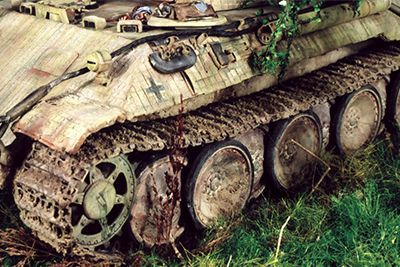 Le "Panther 221", embusqué au fond d’un champ a changé de place tôt dans la matinée pour se placer à l’abri d’un pommier le long d’une haie. Le conducteur a stoppé le blindé pour réparer une légère avarie.