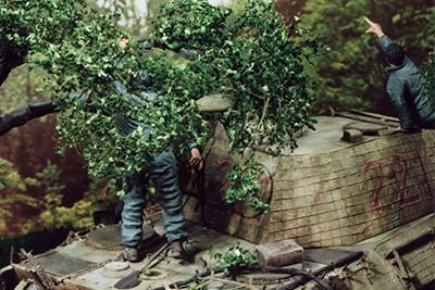 Le décor est étoffé une dernière fois de quelques herbages et mottes de terre véritable le long des chenilles et de leurs empreintes pour faire une bonne liaison entre la maquette et le sol. Puis, des branches cassées sont disposées dans le sillage de l’engin et sur sa plage arrière pour suggérer son précédent déplacement sous le pommier. Le diorama voit son achèvement avec la mise en place définitive des figurines peintes. ;