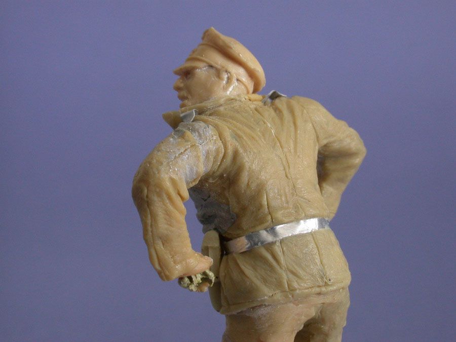 Les parties planes (tour des manches, pans de veste) sont faites avec un morceau de "Tamiya epoxy putty" étalé "façon pâte à tarte" avec un outil cylindrique enduit de talc (manche de X-Acto par exemple), puis coupé dans la bonne dimension, ou à peu près, avant d’être délicatement mis en place à l’endroit voulu, toujours avec un cure-dent humide.