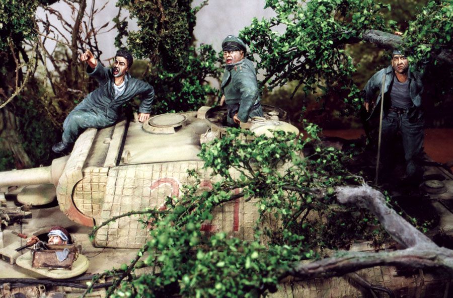 Les cinq tankistes découvrent les avions et animent la scène: pour des raisons de "solidité", une aiguille de couture chauffée à la flamme d’un briquet est enfoncée dans une chaussure ou une main de chaque figurine qui est littéralement "plantée" dans le décor ou sur le char ; une étape faite avant peinture bien évidemment.