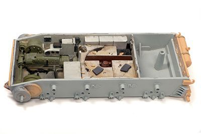 Je me suis autorisé deux écarts vis-à-vis de l’engin d’origine : j’ai laissé la tourelle telle qu’elle, car je ne me sentais pas le courage de la refaire ; et je n’ai pas présenté l’intérieur de l’engin détruit, pour la même raison.