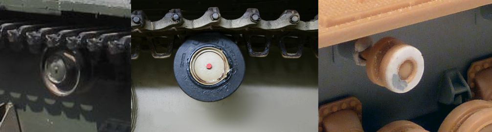 Ce qui implique la modification des galets de retour, car Tamiya fournit des galets métal, alors que l'engin est équipé de galets en caoutchouc. Mais aussi des barbotins, qui sont ajourés au lieu d’être plein. Cependant, Tamiya fournit deux jeux de roues tendeuse, dont celles requises.