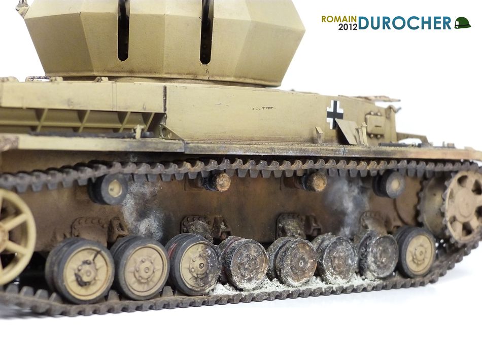 Ensuite, le tout a été protégé avec un vernis mat, des pigments rouille ont été appliqués à sec sur la surface verticale, et d’autres blancs en dépôt sur le train de roulements et chenilles.