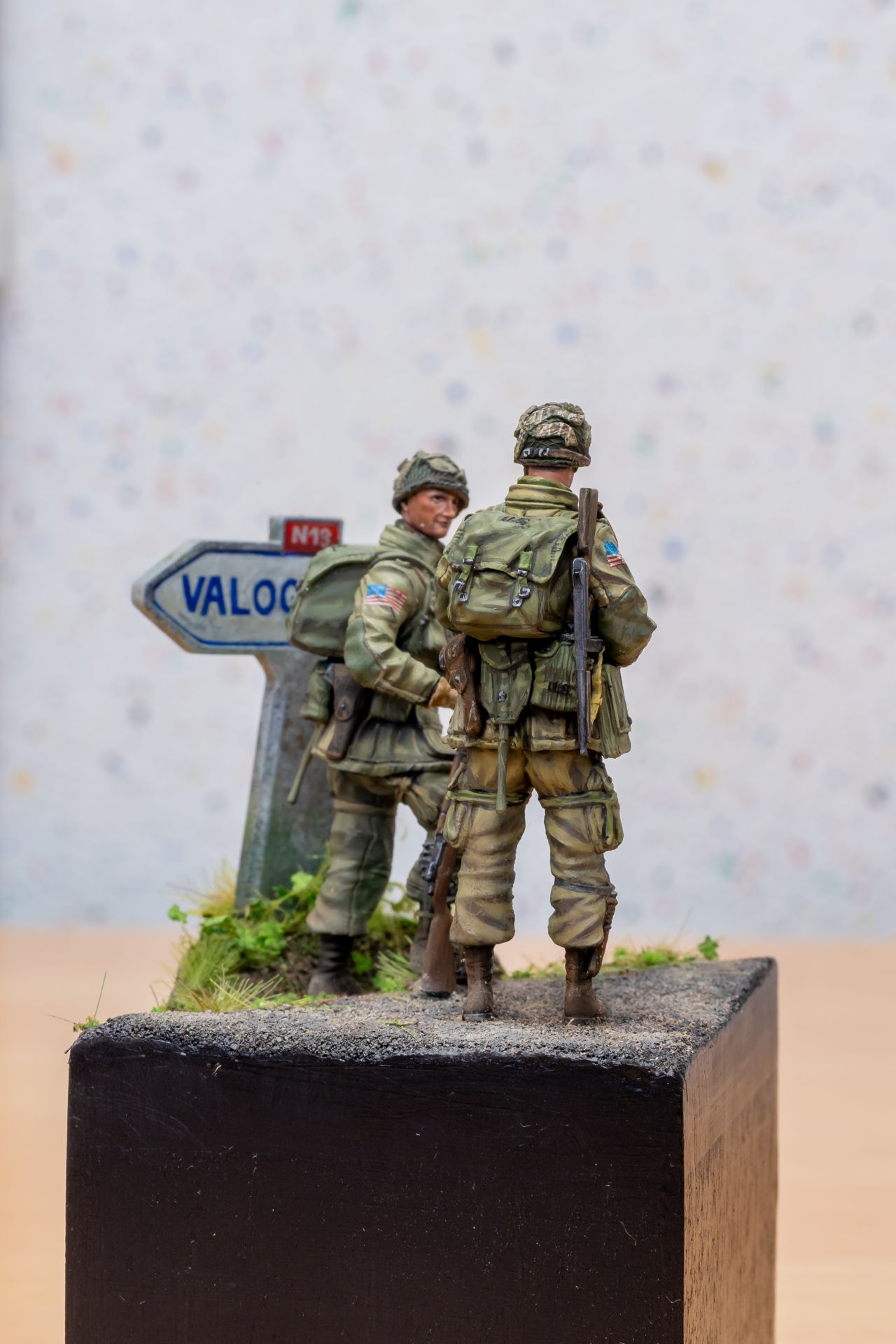 Parachutés sur la DZ près de Neuville-au-Plain, le long de la Nationale 13. Ils cherchent à s'orienter pour rejoindre Sainte-Mère-Église.